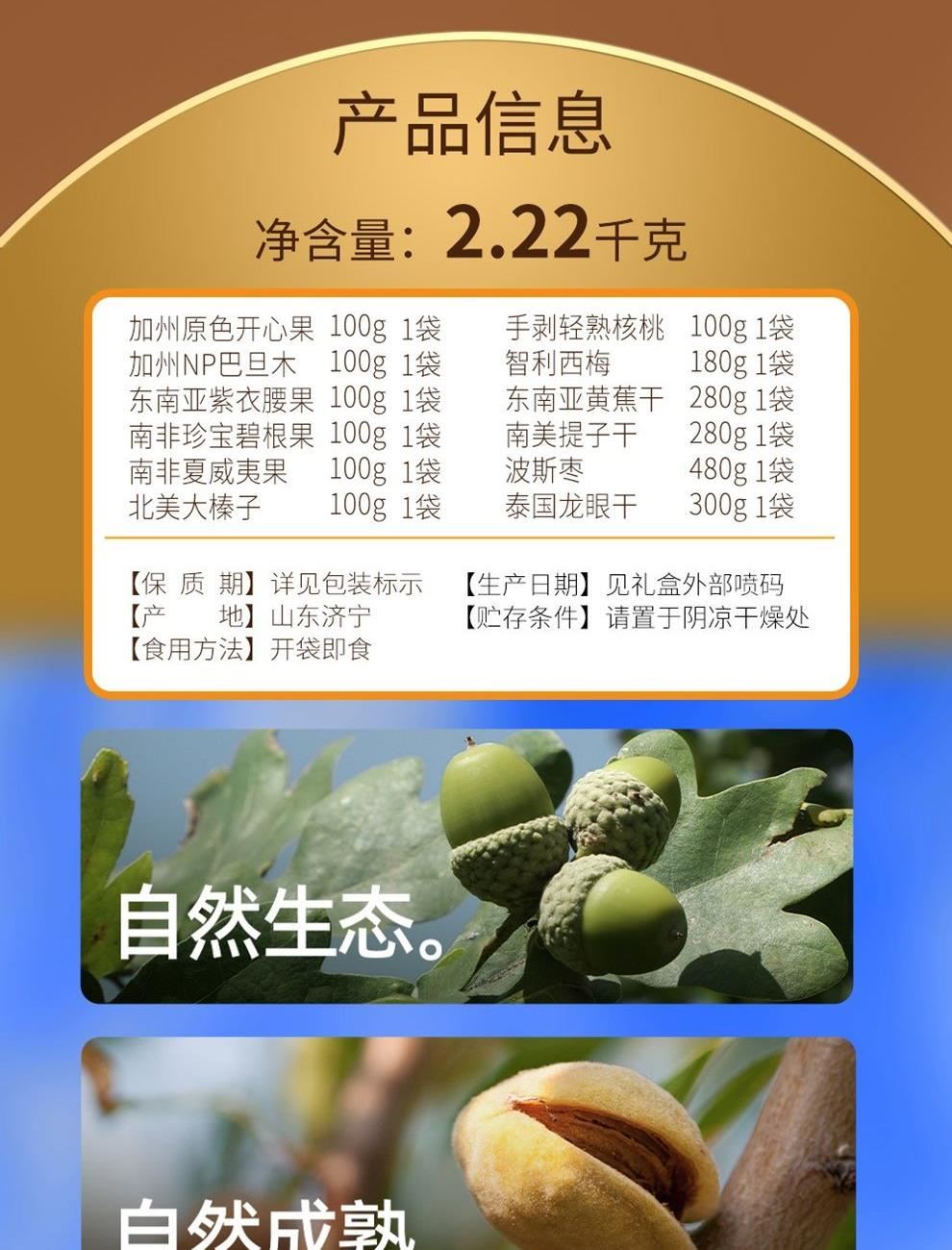 加州原色开心果 100g*1 加州NP巴旦木 100g*1 东南亚紫衣腰果 100g*1 南非珍宝碧根果 100g*1 南非夏威夷果 100g*1 北美大榛子 100g*1 手剥轻熟核桃 100g*1 智利西梅 180g*1 东南亚黄蕉干 280g*1 南美提子干 280g*1 波斯枣 480g*1 泰国龙眼干 300g*1 合计:2220g